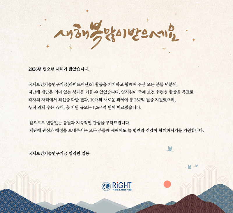 국제보건기술연구기금(Research Investment for Global Health Technology Foundation, 이하 ‘라이트재단’)은 한국 정부, 게이츠재단 그리고 한국 생명과학 기업의 3자간 협력을 통해 국제 보건 형평성을 향상하는 R&D를 지원하기 위해 설립된 최초의 민관 협력 비영리 재단입니다.